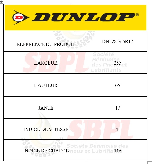 Accueil>Pneu>Pneu voiture & 4*4>DUNLOP>SBPL_DUNLOP 285/65R17